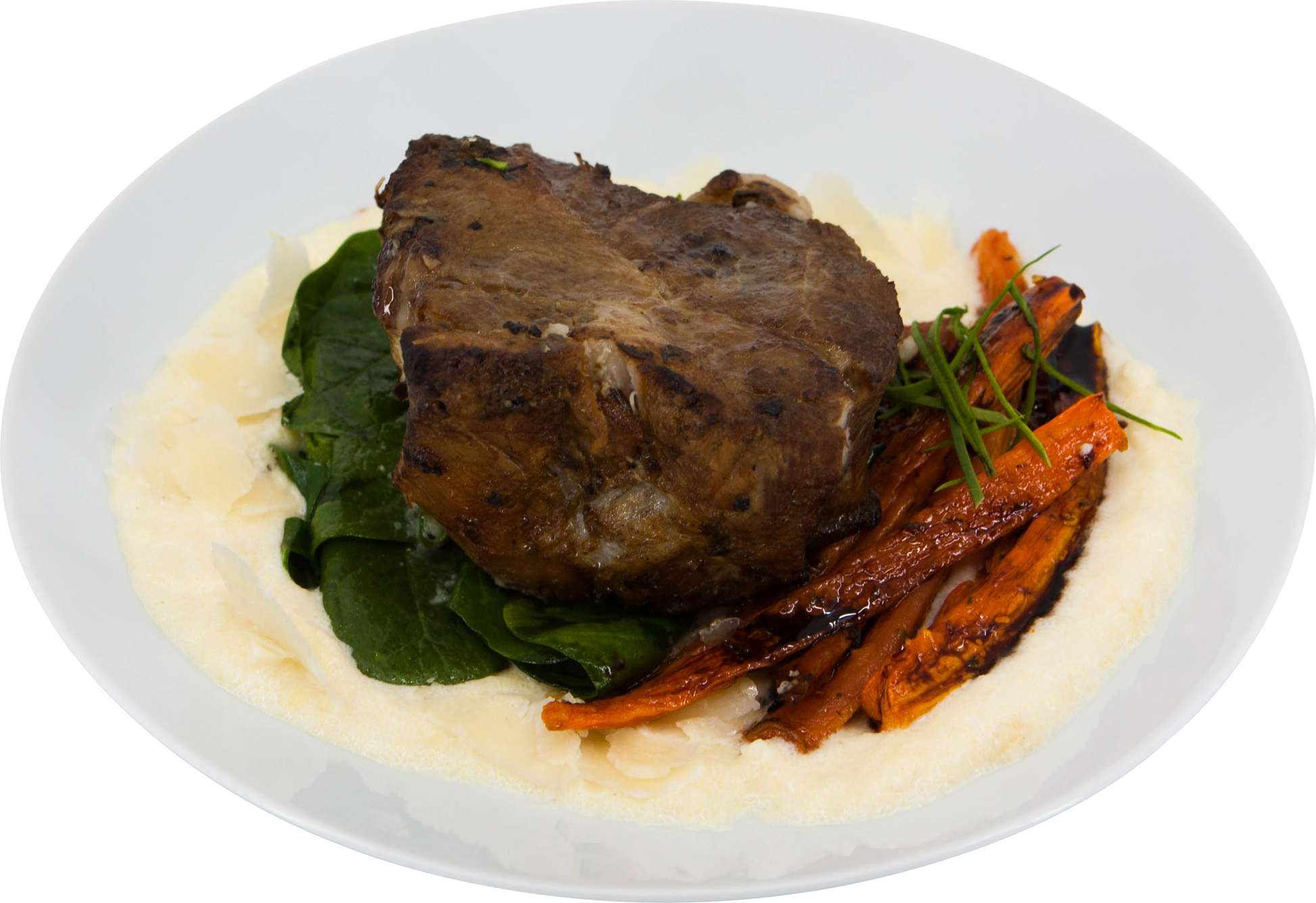 Cidre de pomme au porc lentement braisé , épinards sautés, carottes glacées au balsamique et polenta crémeuse