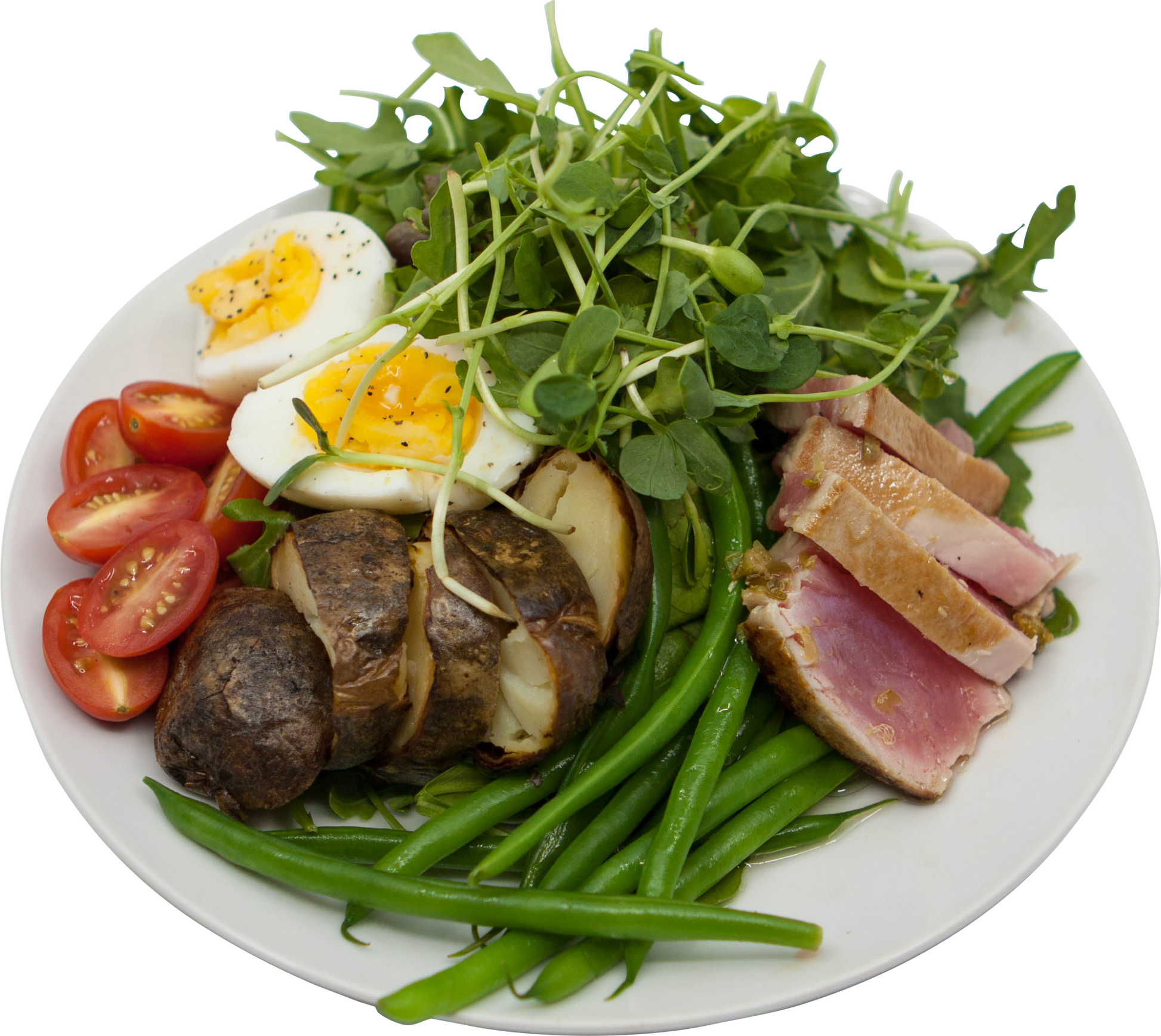 Thon, œuf, pommes de terre, haricots verts, légumes verts des champs, tomates cerises, câpres, citron, orange, dijon, huile d'olive, sucre, sel, persil, ail