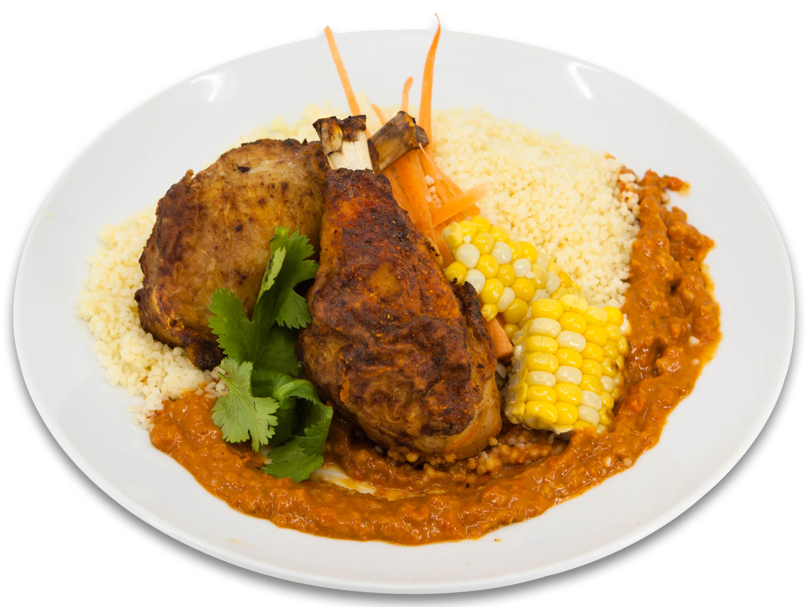 Pilon de poulet cuit lentement dans une sauce Piri-Piri au citron, servi avec maïs et quinoa zesté aux agrumes.
