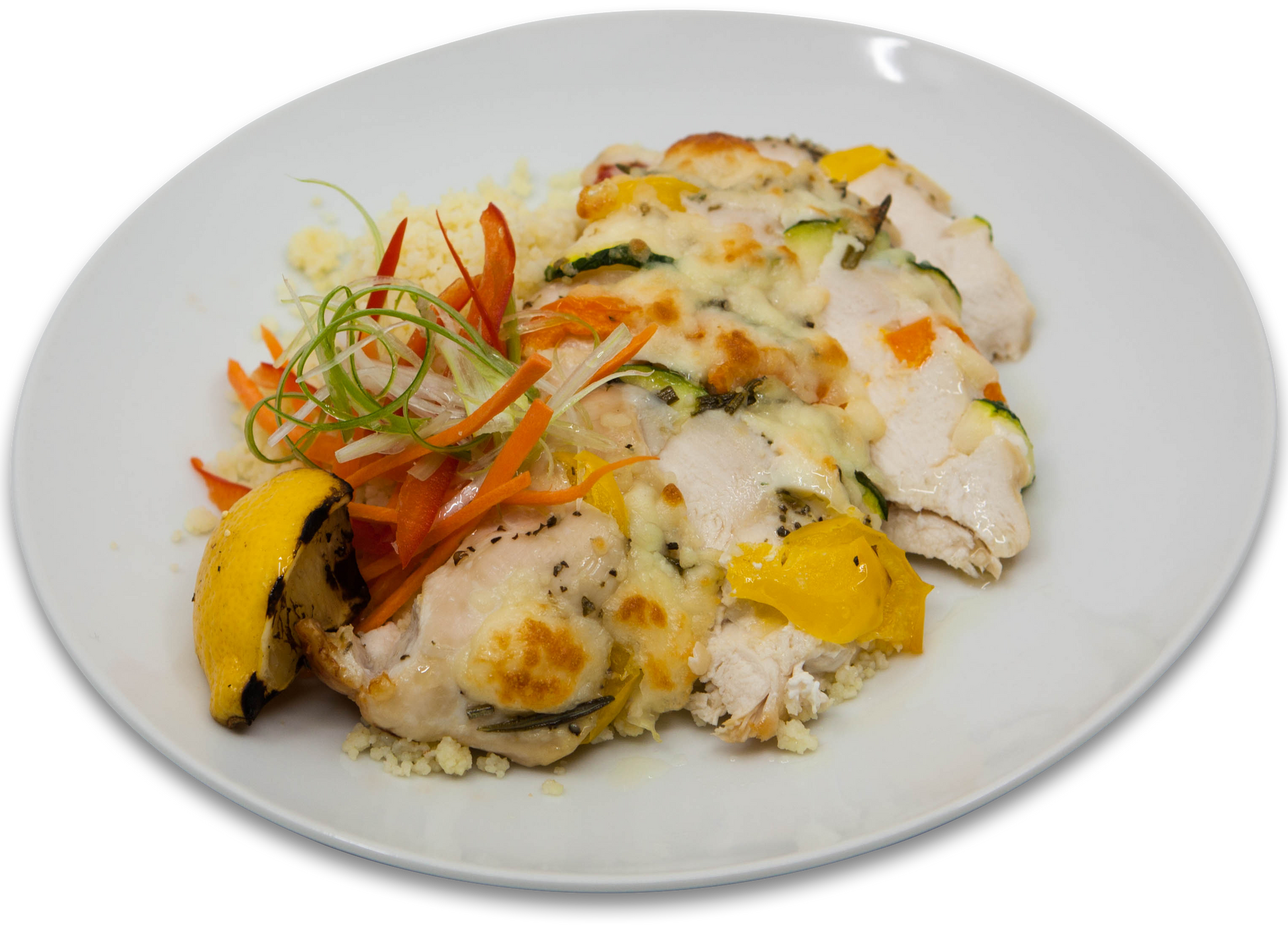 Poitrines de poulet au romarin poêlées, farcies de poivrons rôtis et de courgettes, servies avec couscous au citron et garnies de fromage provolone italien et de fromage mozzarella.