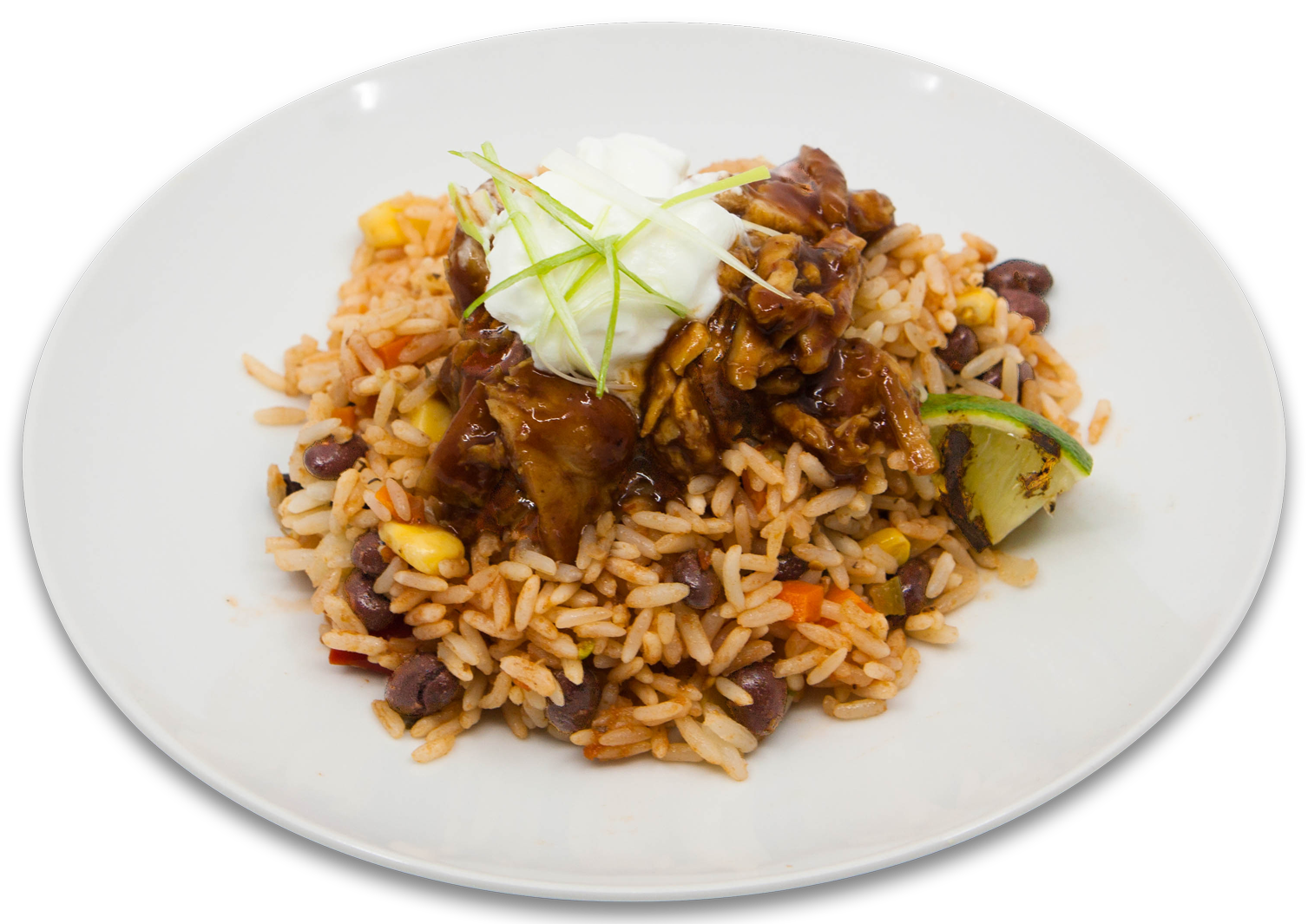 Poulet braisé au piment Guajillo épicé avec haricots noirs et riz mexicain au maïs avec coriandre crèma